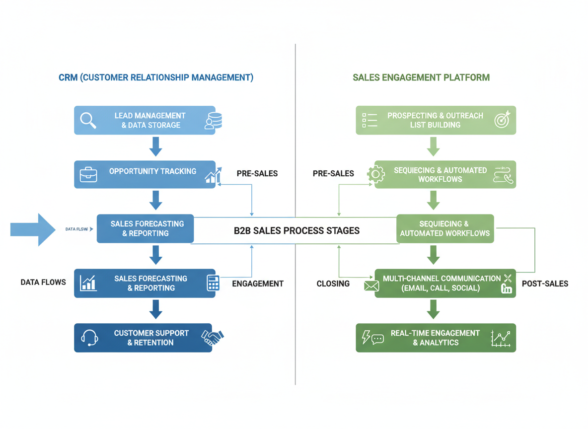 CRM systems and sales engagement platforms serve different but complementary roles in B2B sales. One manages relationships and revenue. The other enables efficient outreach and follow up.